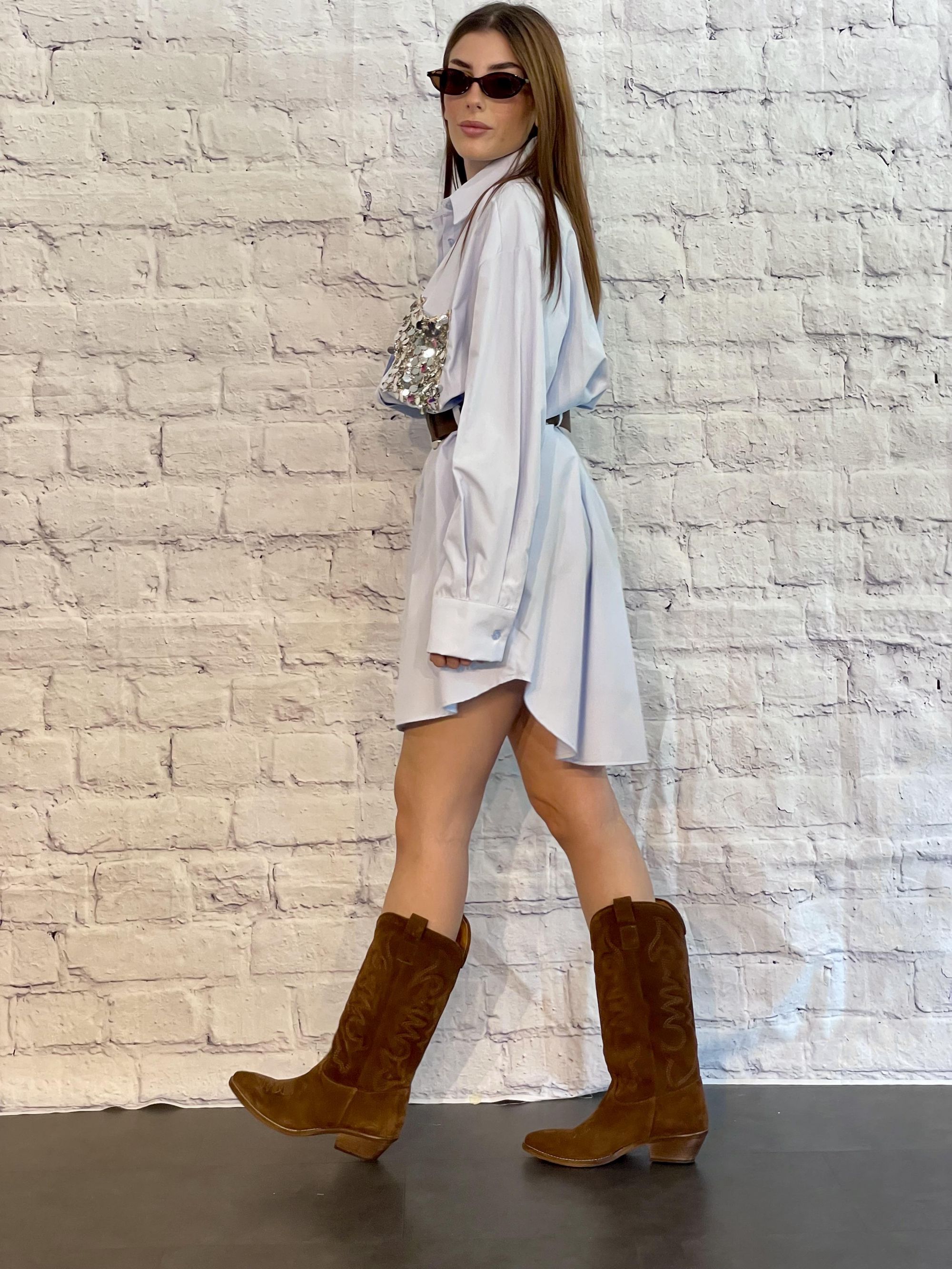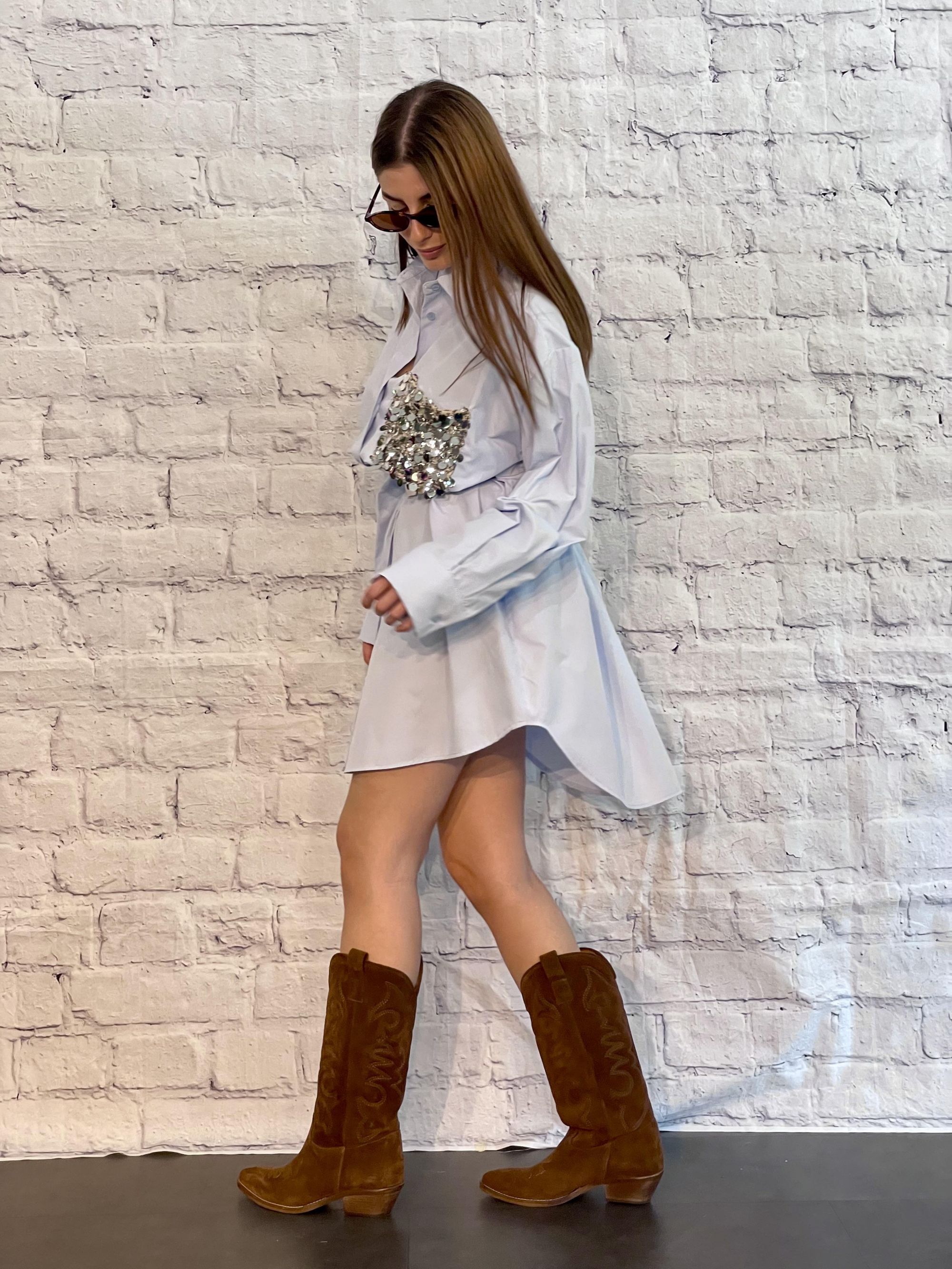 TENSIONE IN - ABITO/CAMICIA CELESTE CON TASCA IN PAILLETTES ART. PE260160