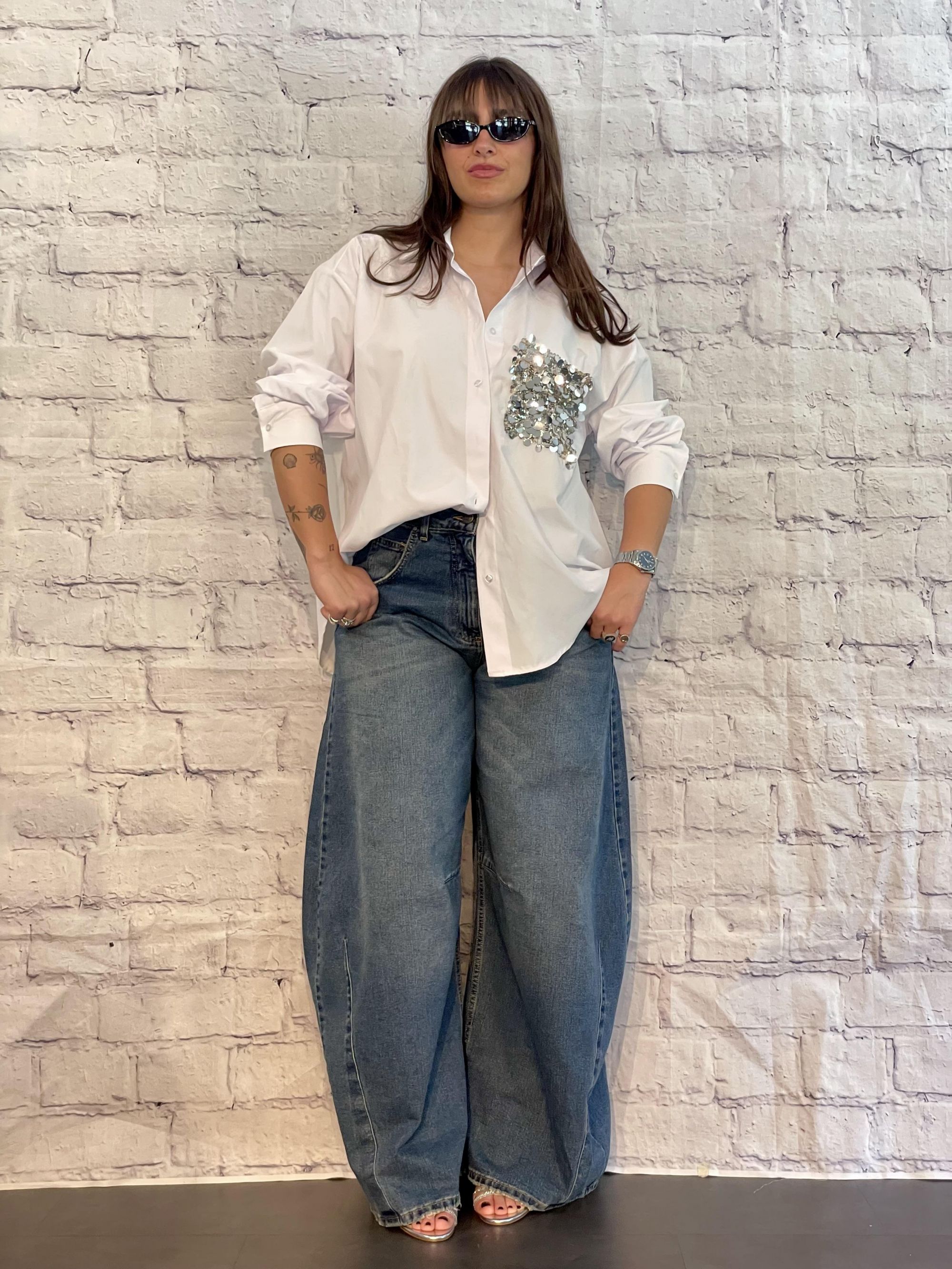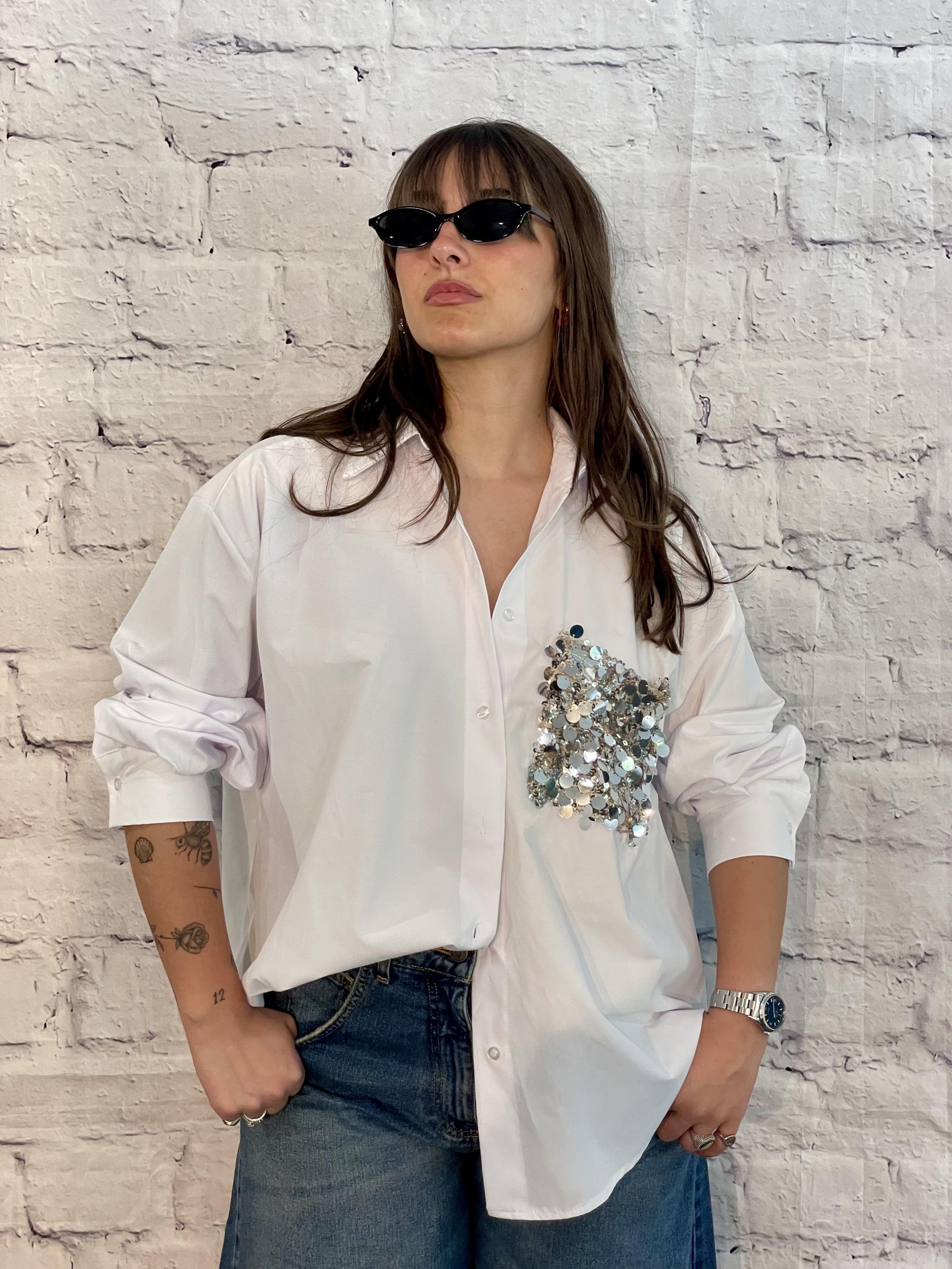 TENSIONE IN - CAMICIA IN COTONE BIANCO CON TASCHINO DI PAILLETTES ART. PE260048-U
