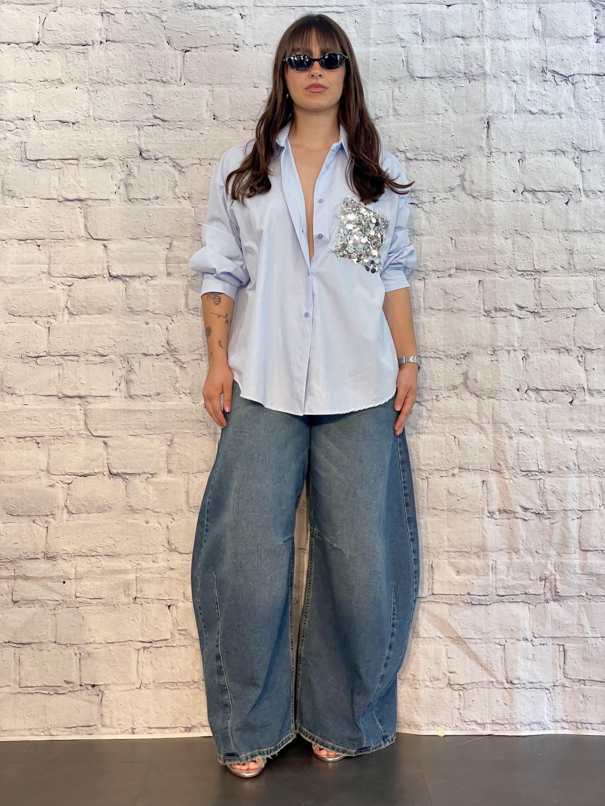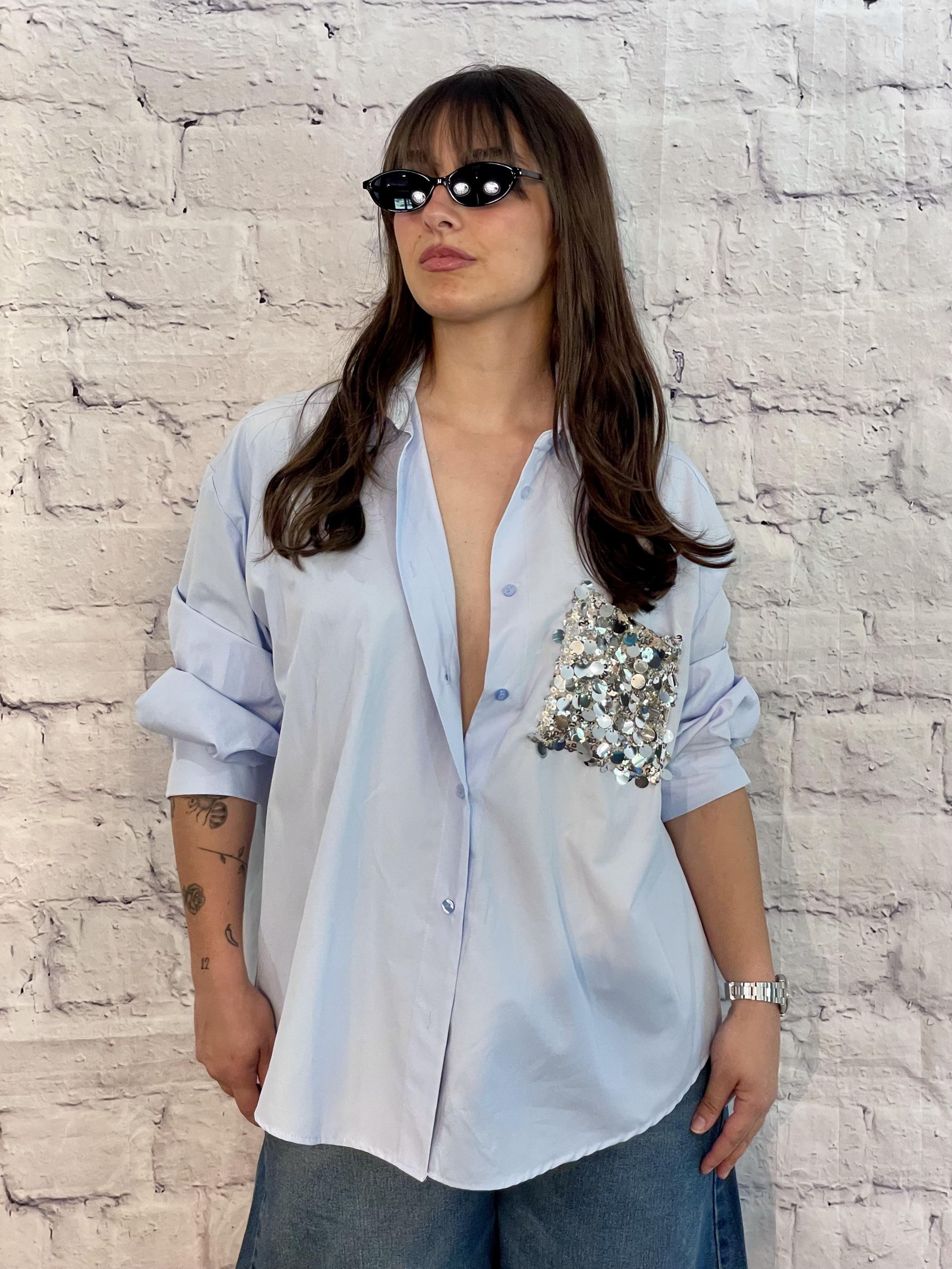TENSIONE IN - CAMICIA IN COTONE CELESTE CON TASCHINO DI PAILLETTES ART. PE260048-U