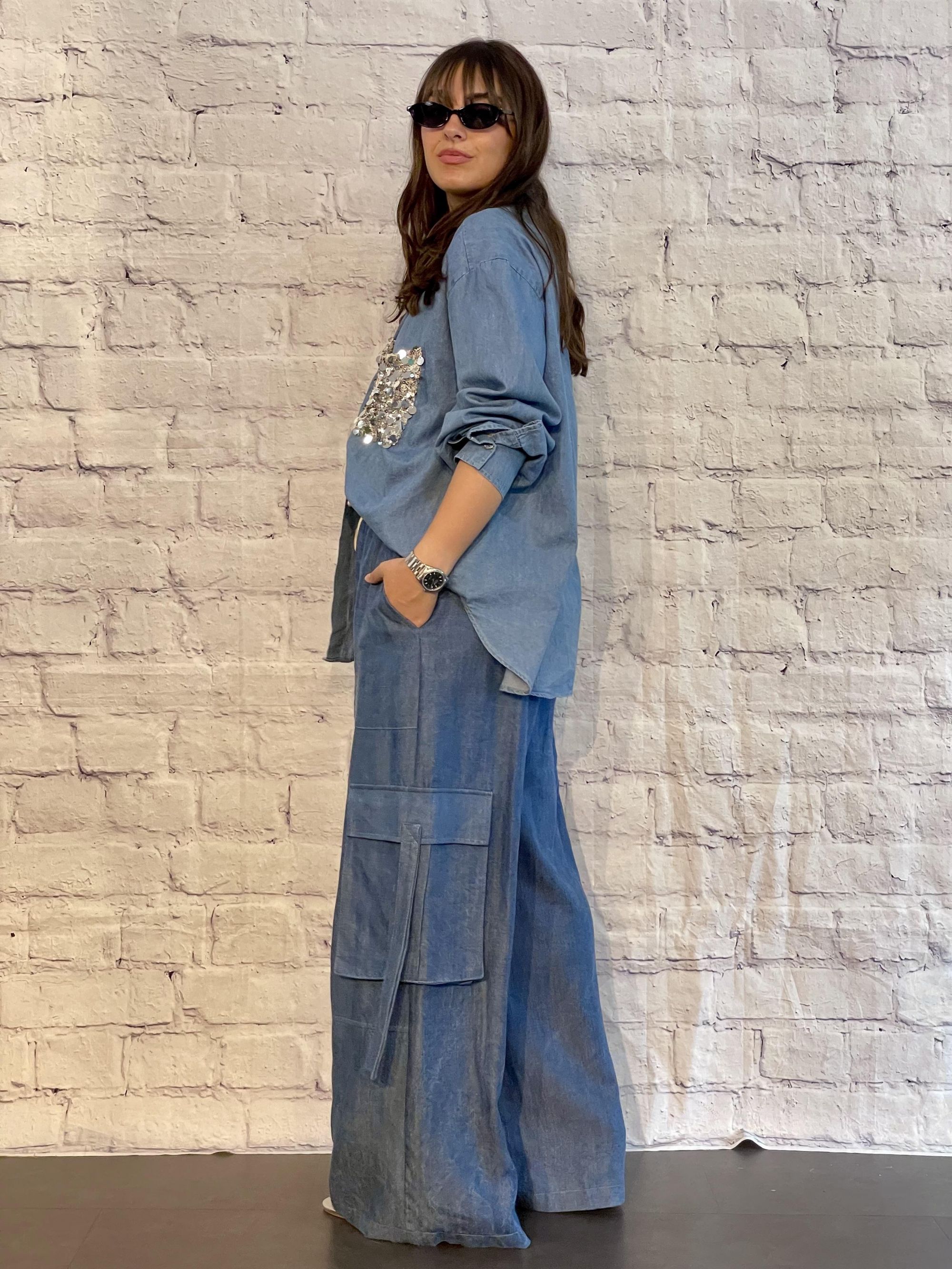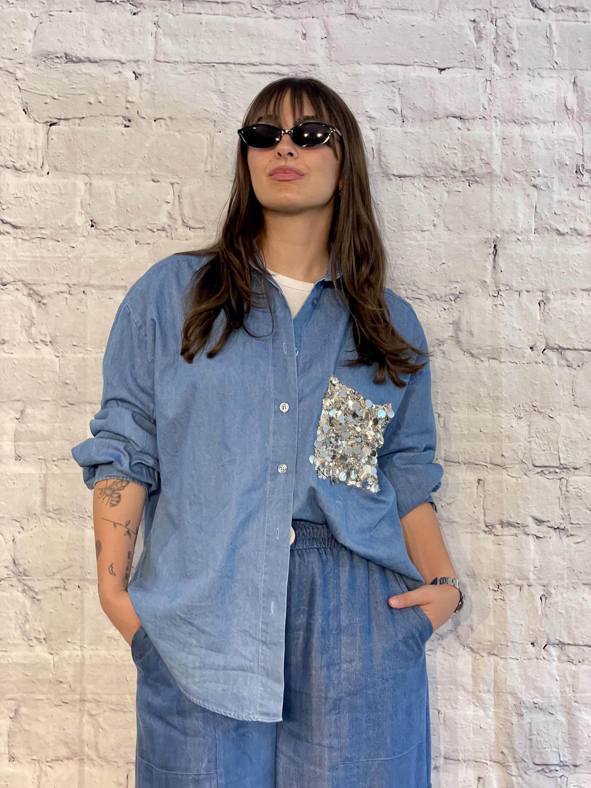 TENSIONE IN - CAMICIA IN DENIM BLU CON TASCHINO IN PAILLETTES ART. PE260153