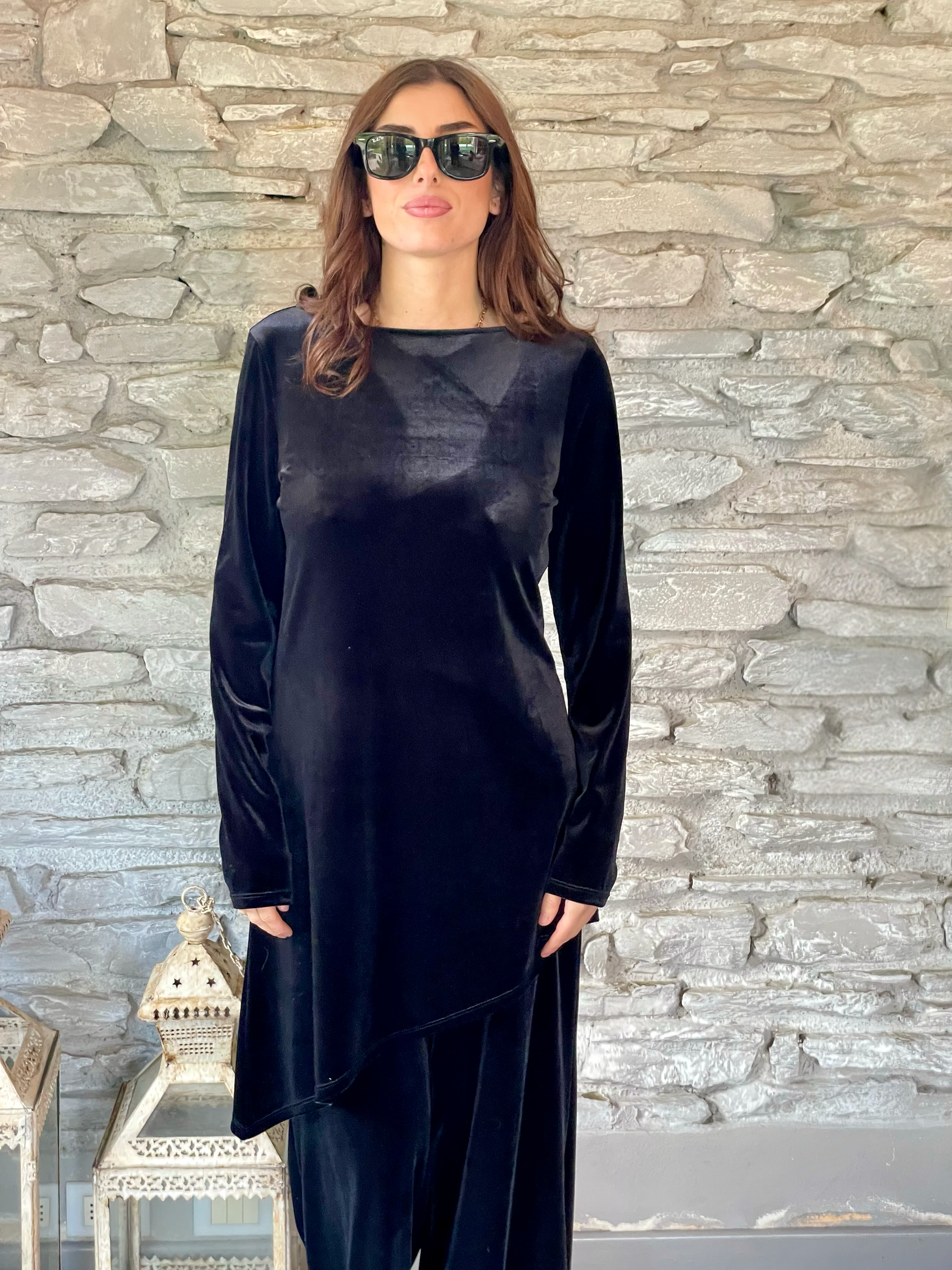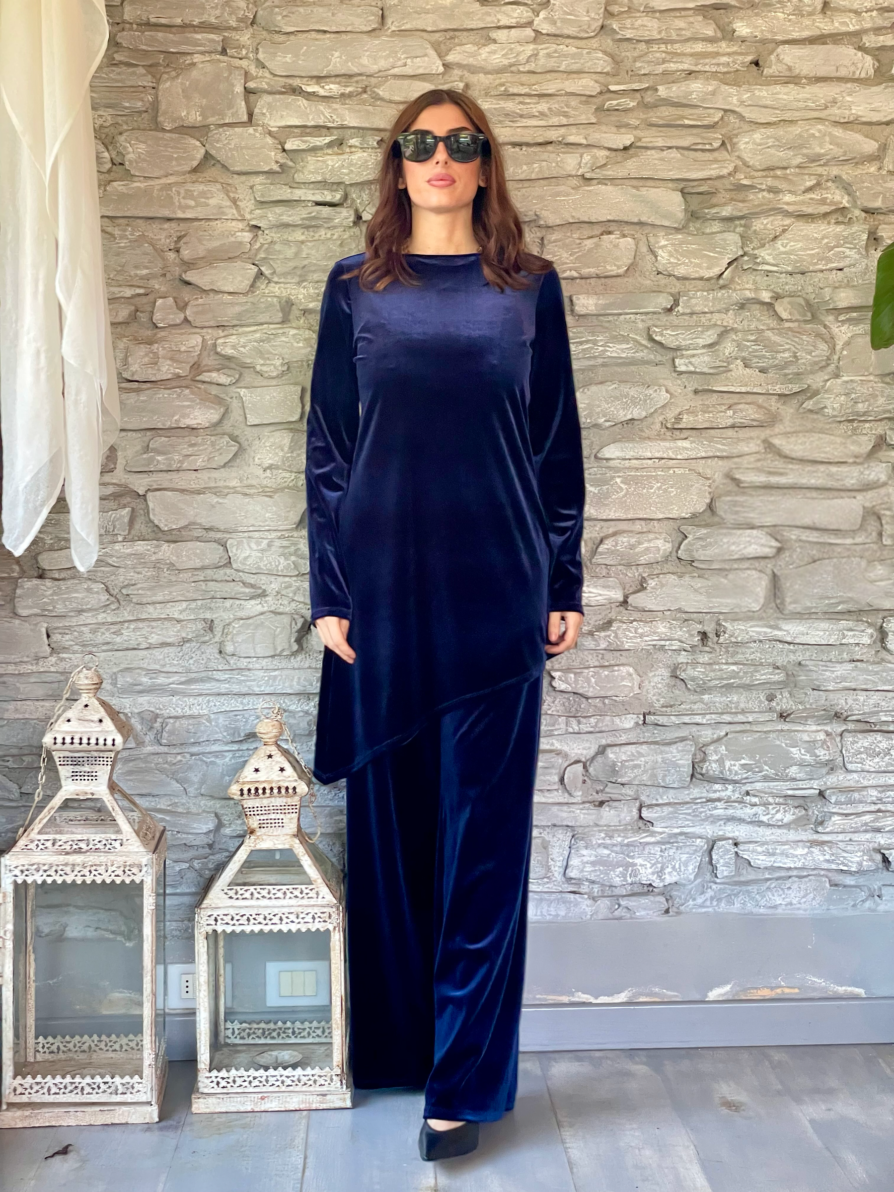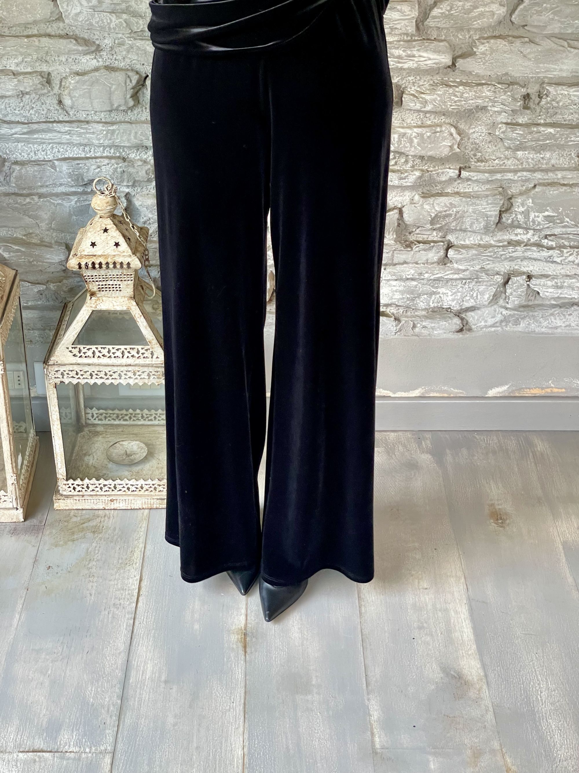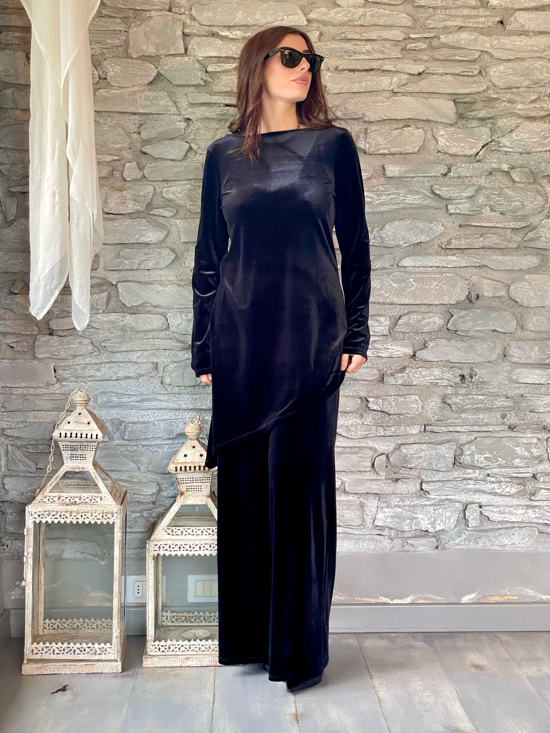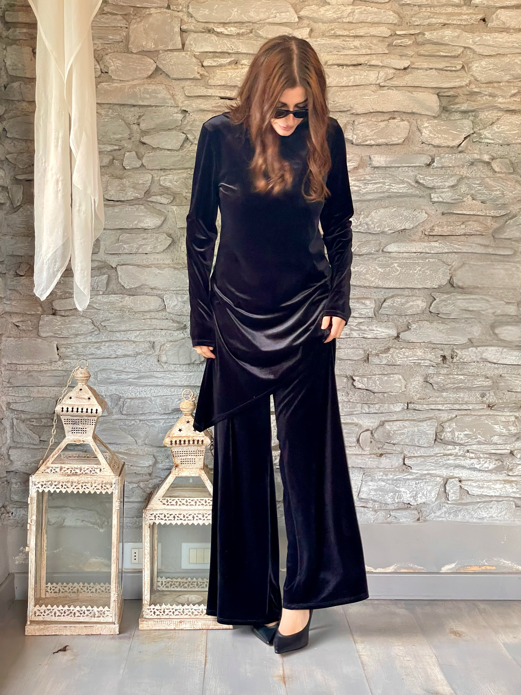 TENSIONE IN - COMPLETO BLUSA E PANTALONE IN VELLUTO LISCIO NERO ART. L50002AT