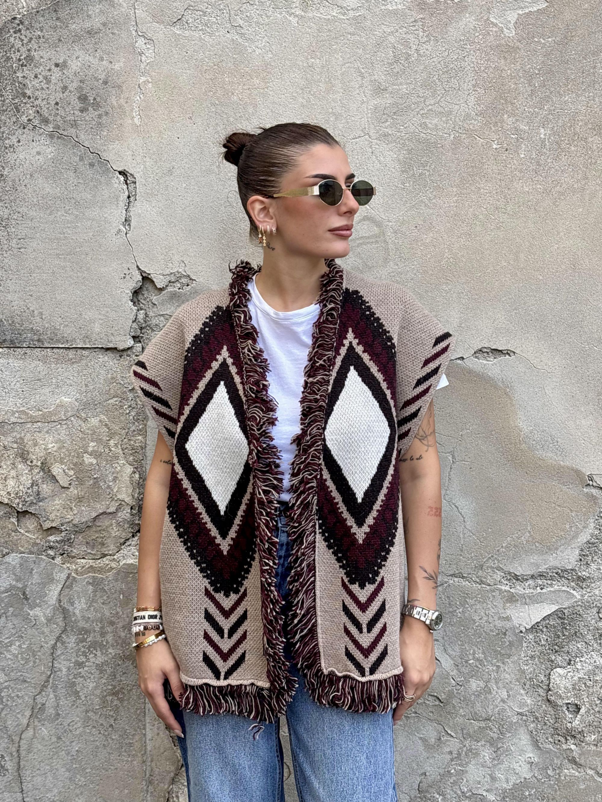 TENSIONE IN - GILET APERTO MARRONE CON DISEGNI GEOMETRICI ART. W5HMG60A400
