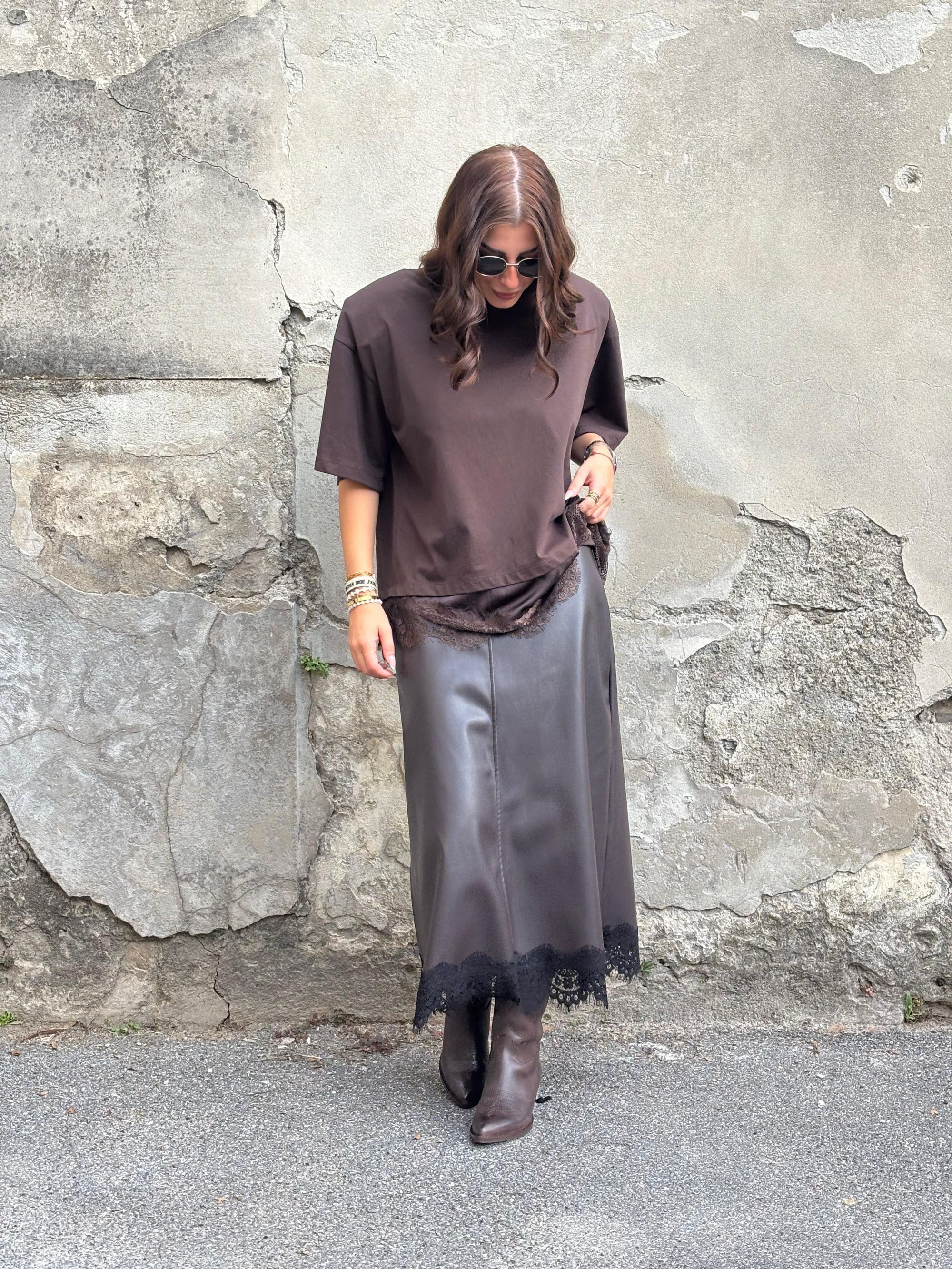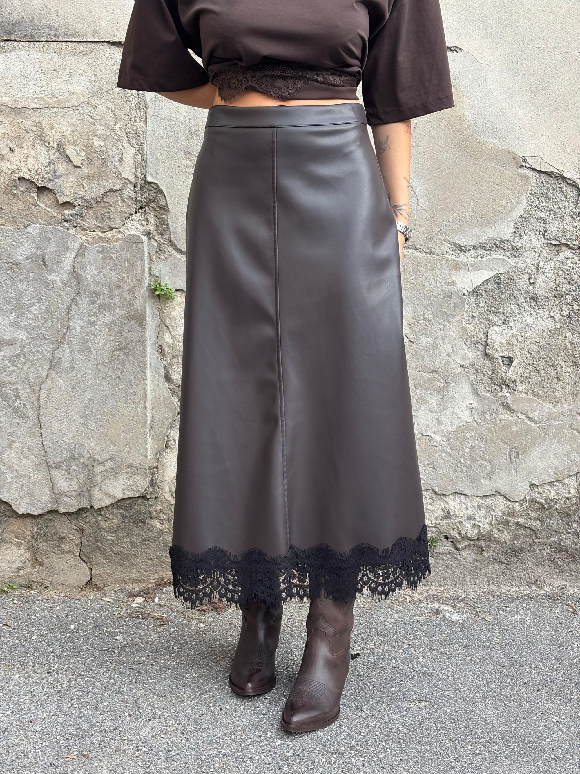 TENSIONE IN - GONNA IN ECOPELLE MORO BORDATA IN PIZZO ART. FW250041