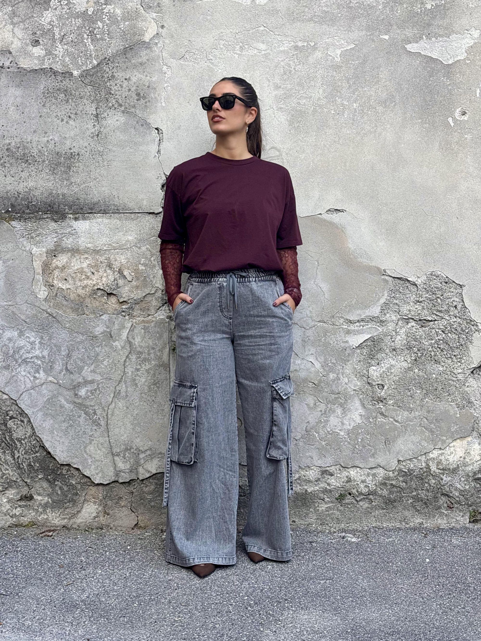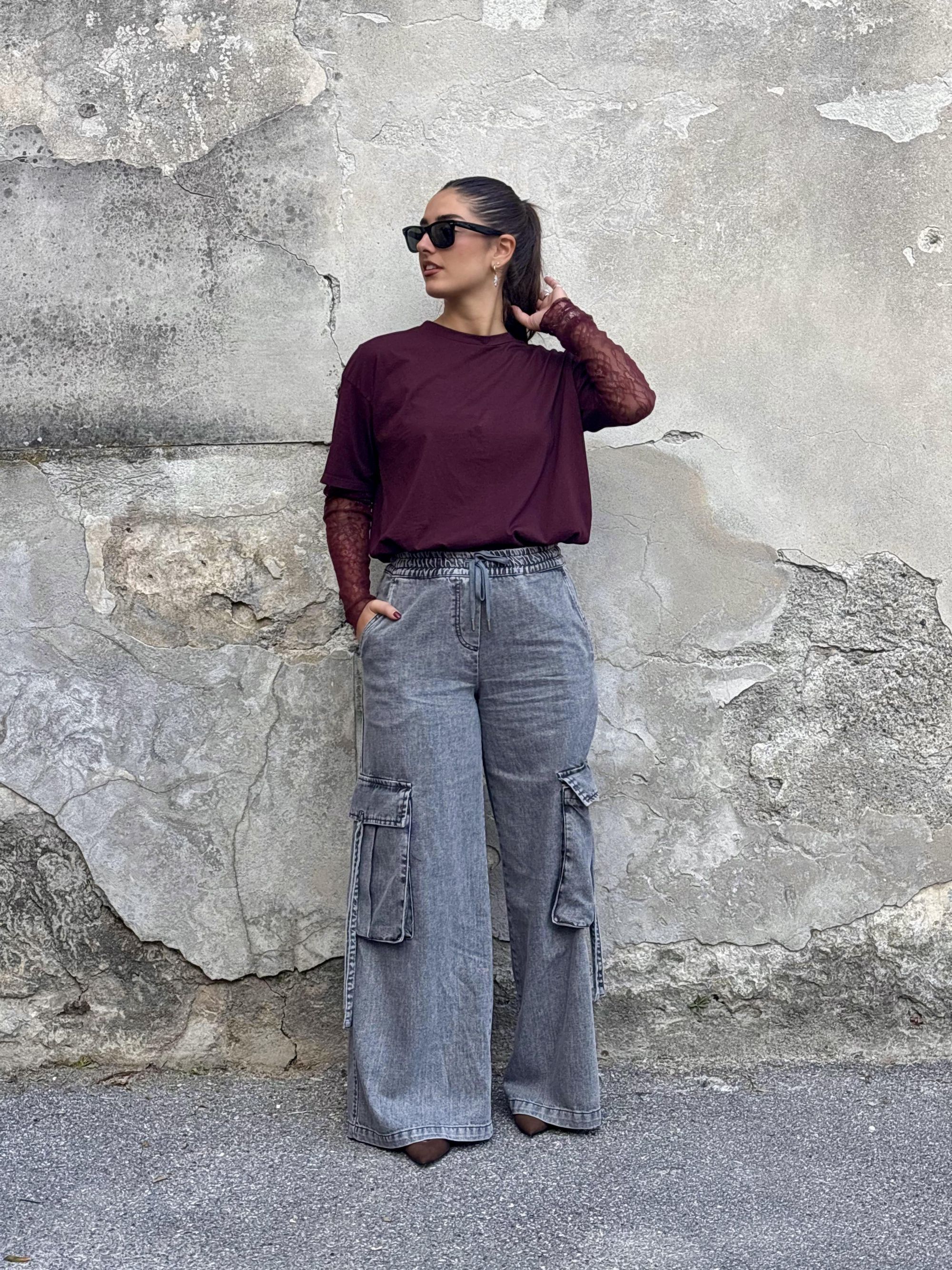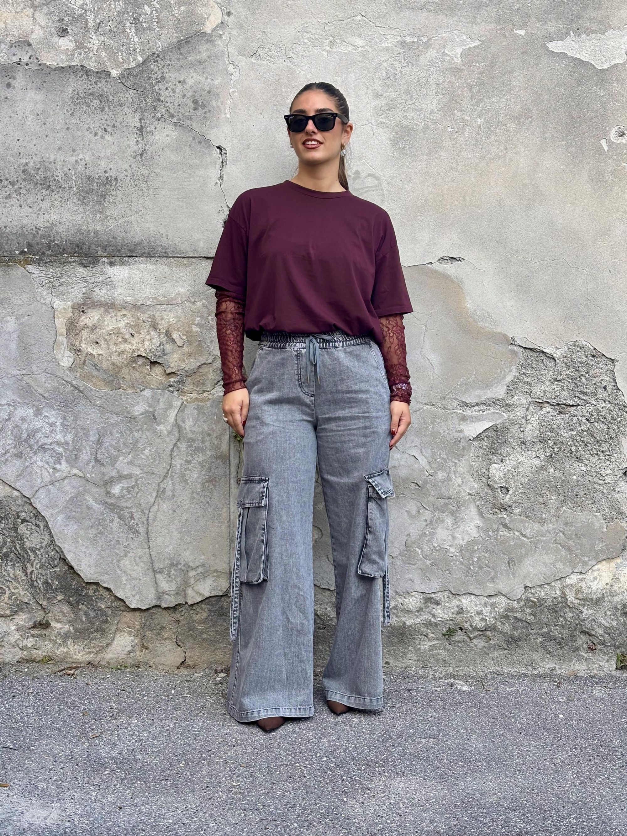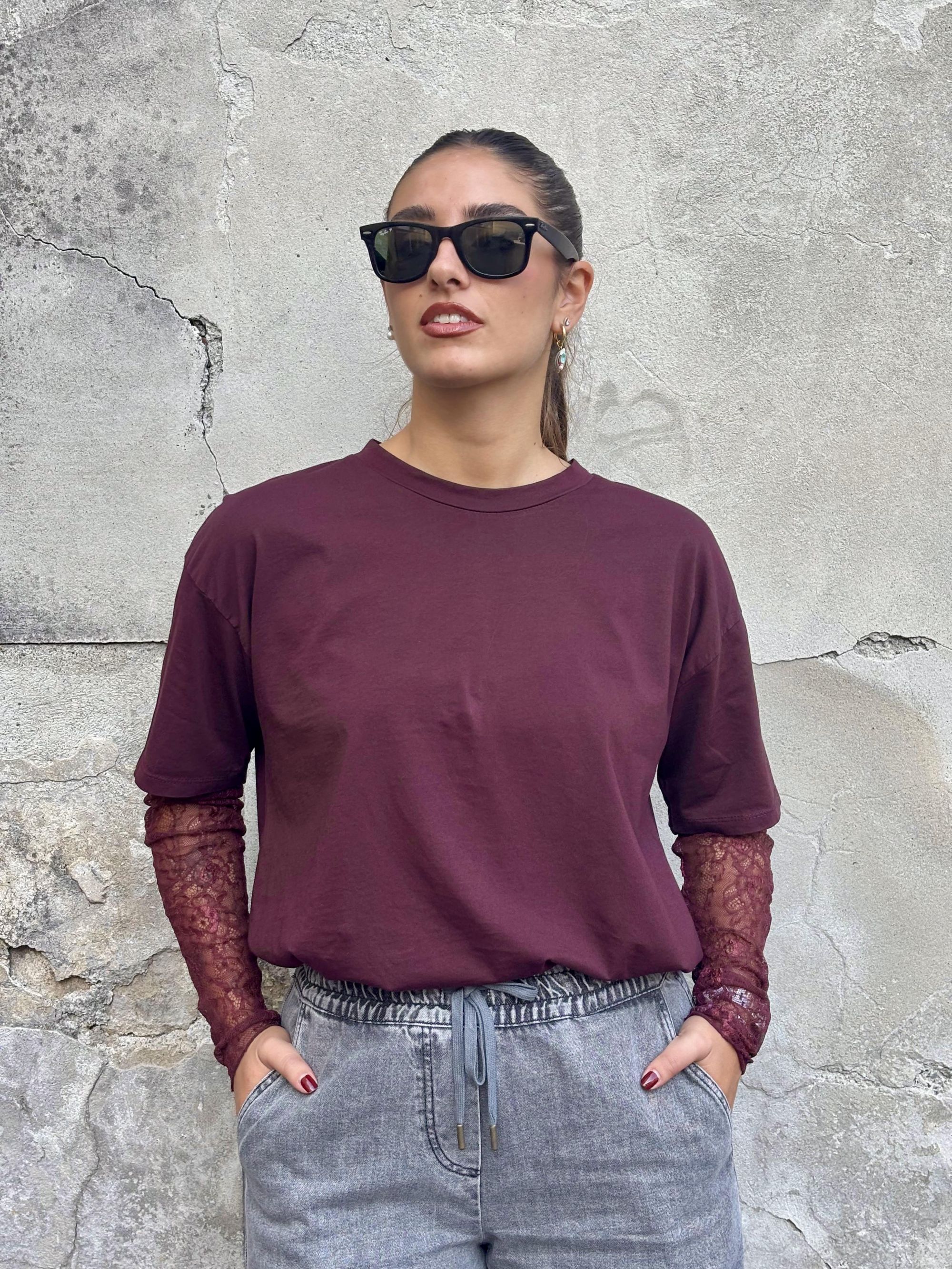 SUSY MIX - T-SHIRT IN COTONE BORDEAUX MANICA IN PIZZO ART. 11073