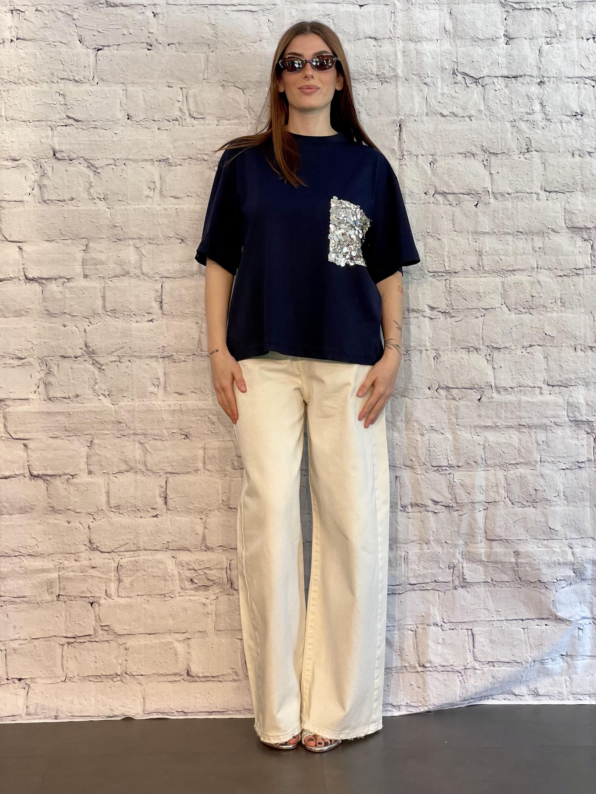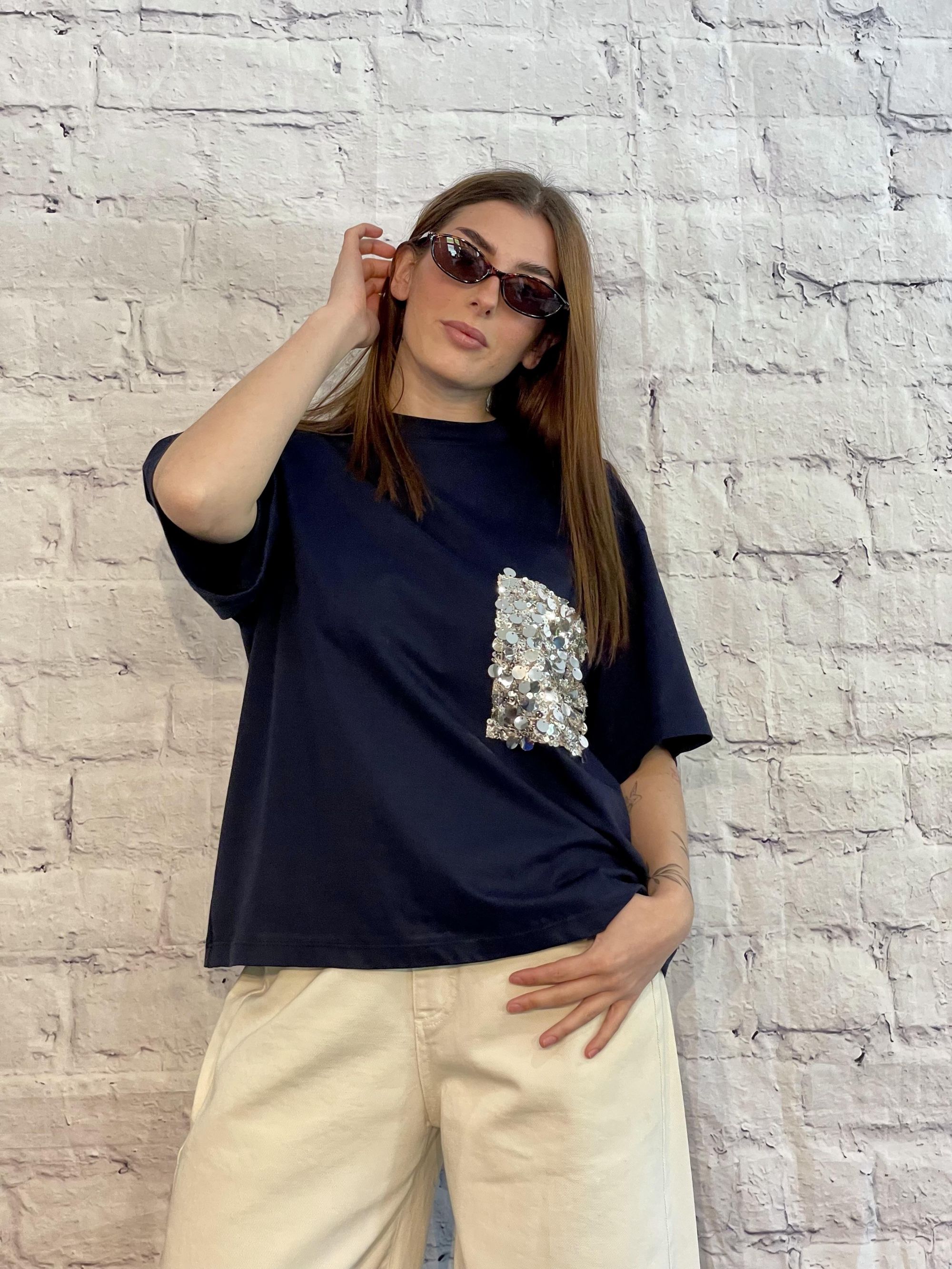TENSIONE IN - T-SHIRT BLU CON TASCHINO DI PAILLETTES ART. PE260112