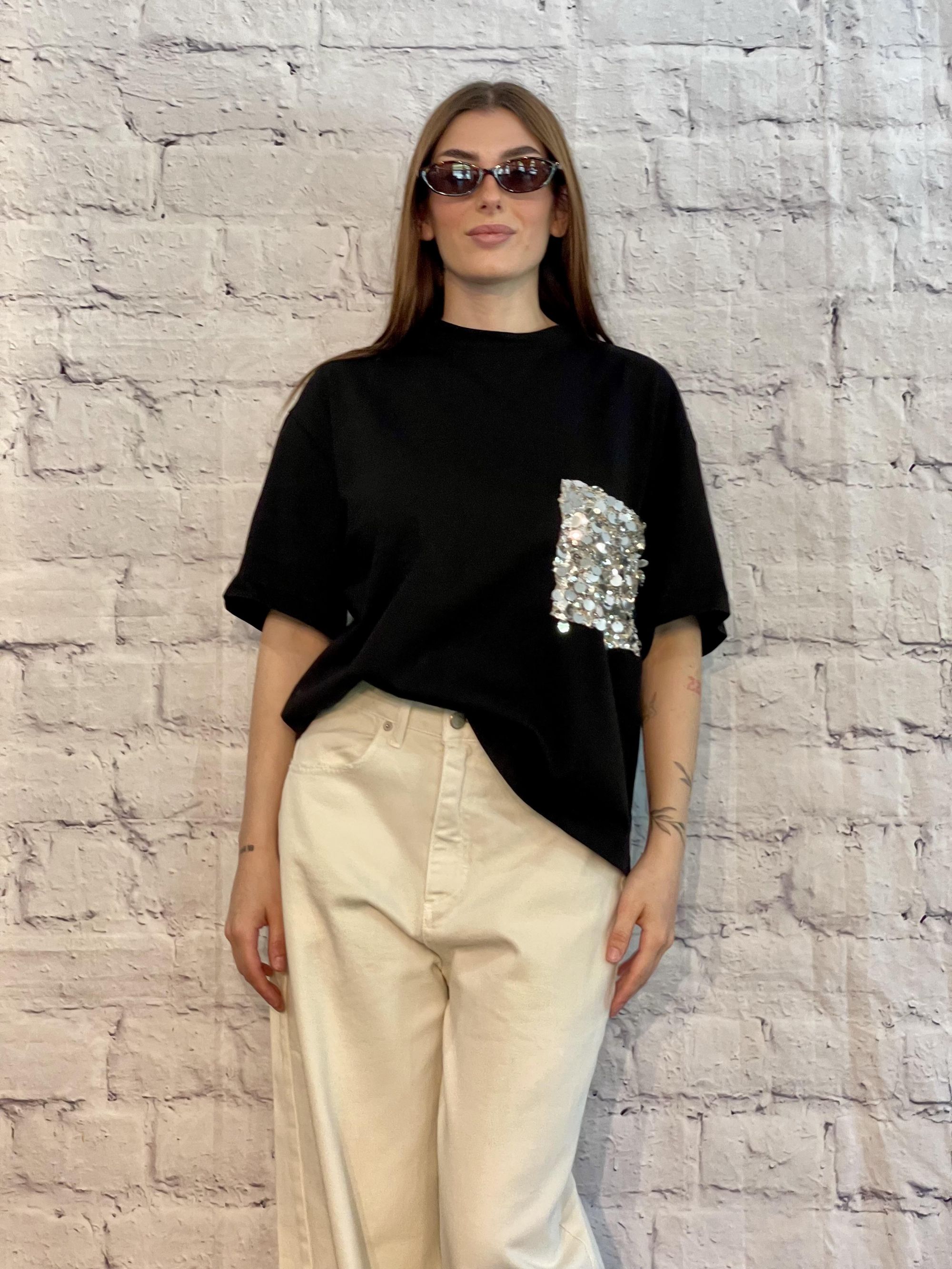 TENSIONE IN - T-SHIRT NERA CON TASCHINO DI PAILLETTES ART. PE260112