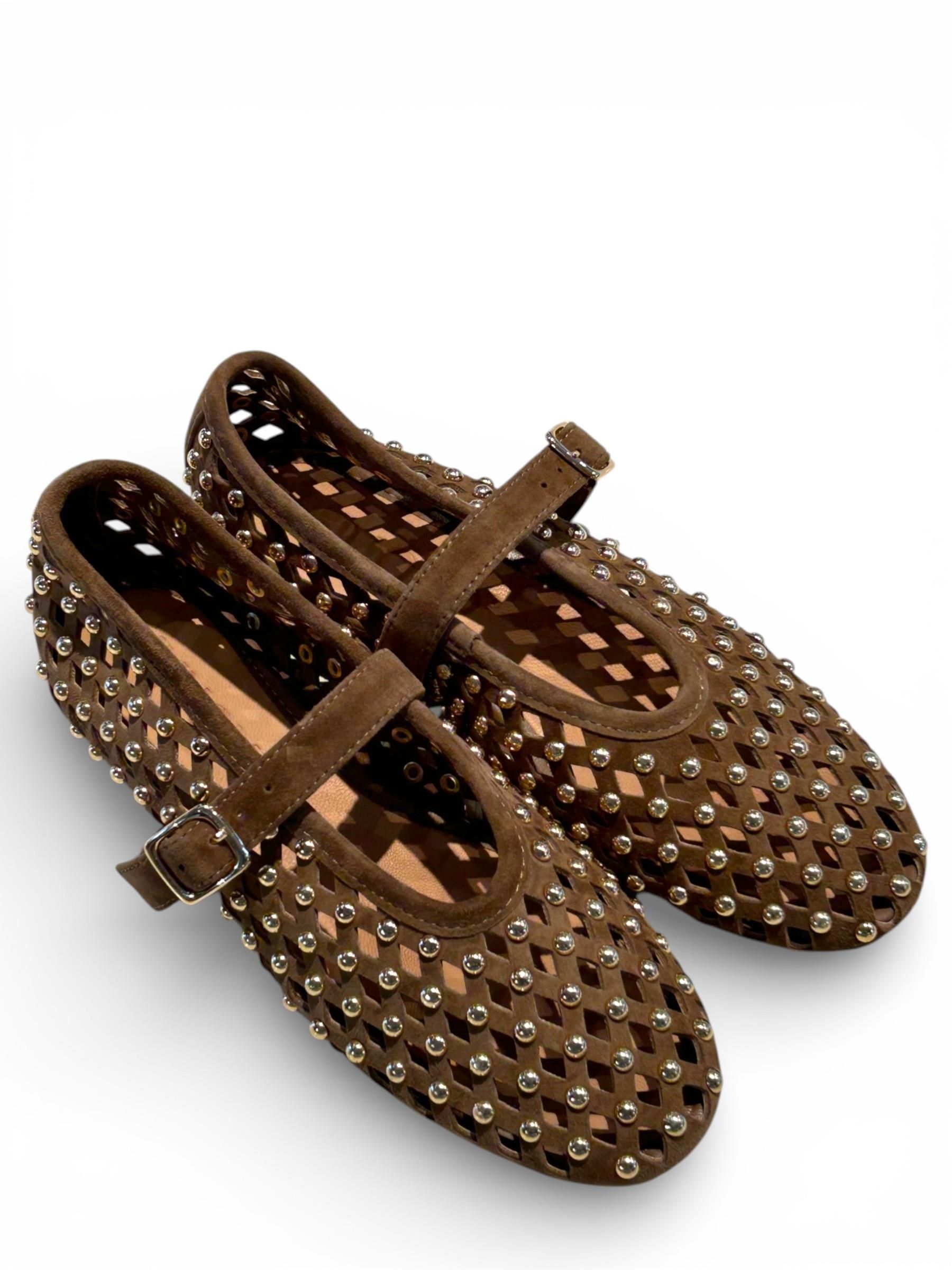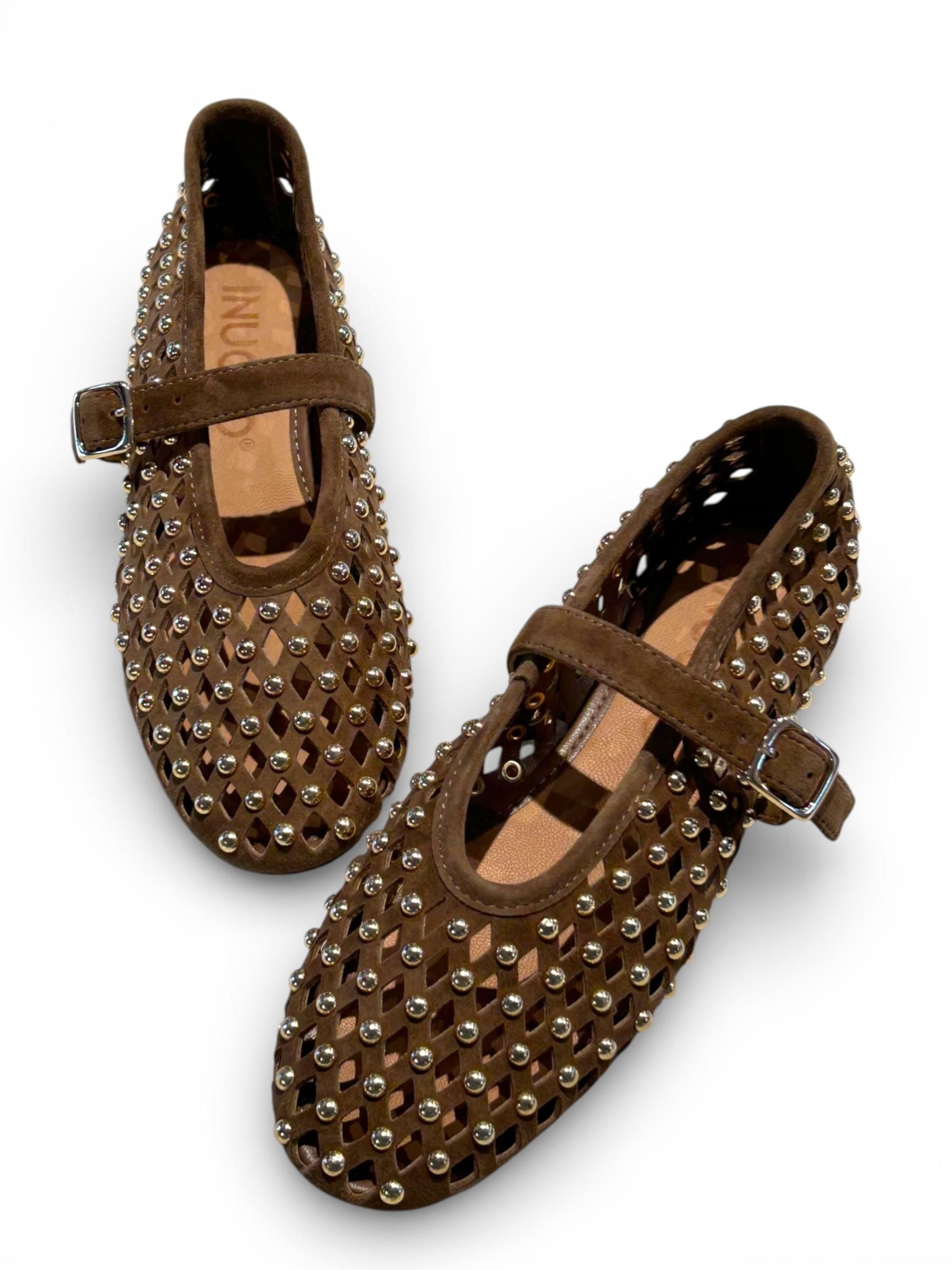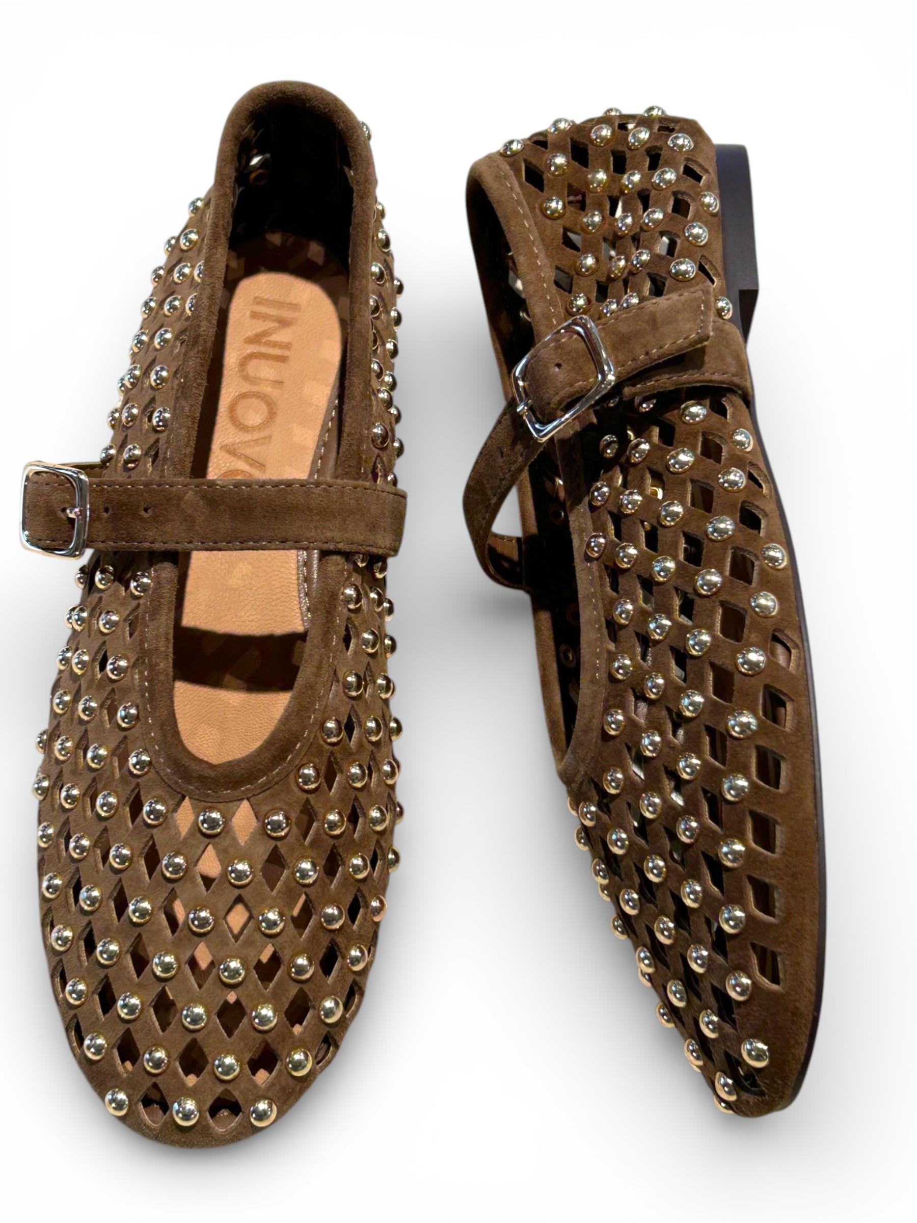 INUOVO - BALLERINE IN CAMOSCIO TRAFORATO COLOR CUOIO CON BORCHIE DORATE ART. CNK003