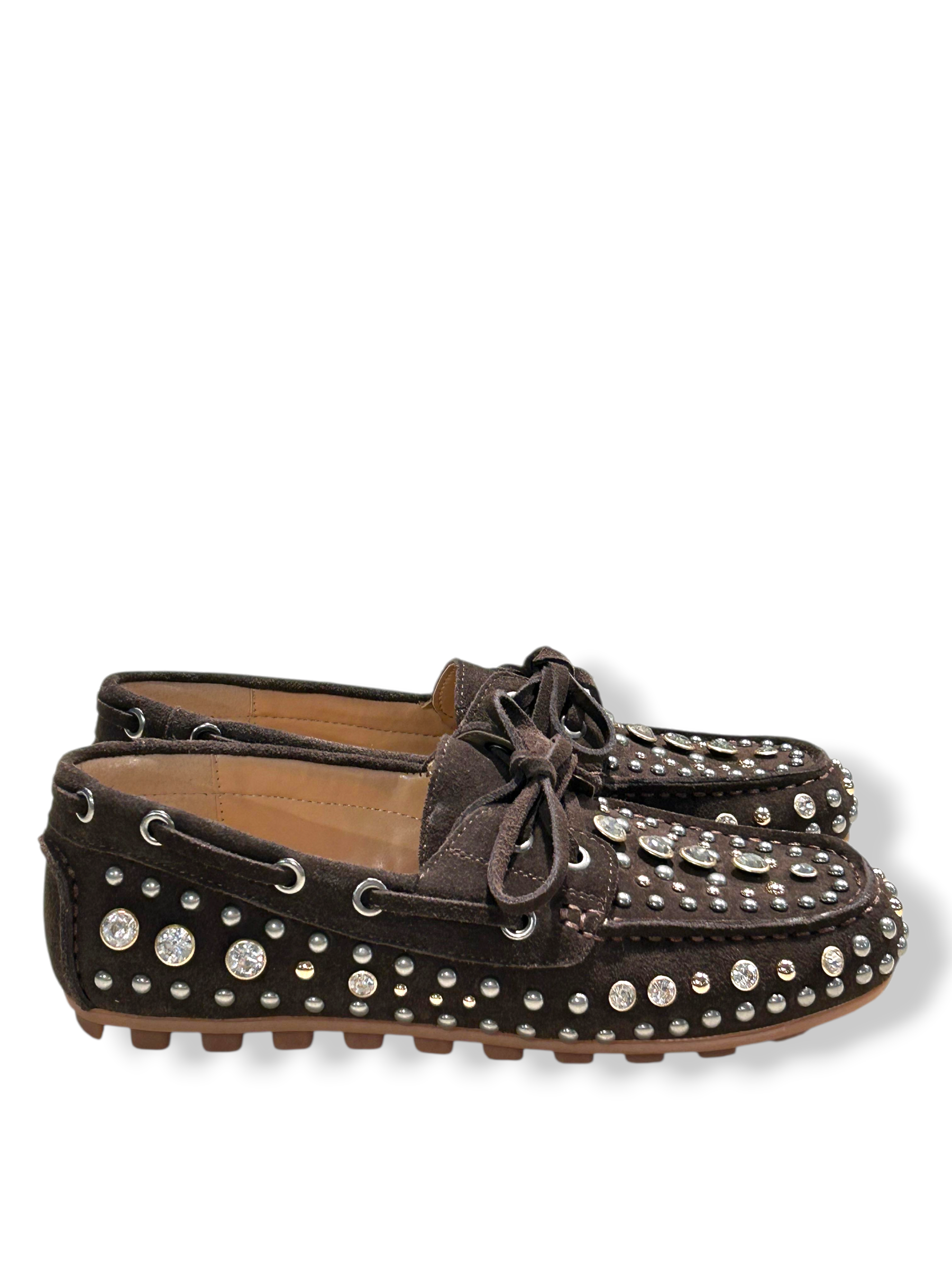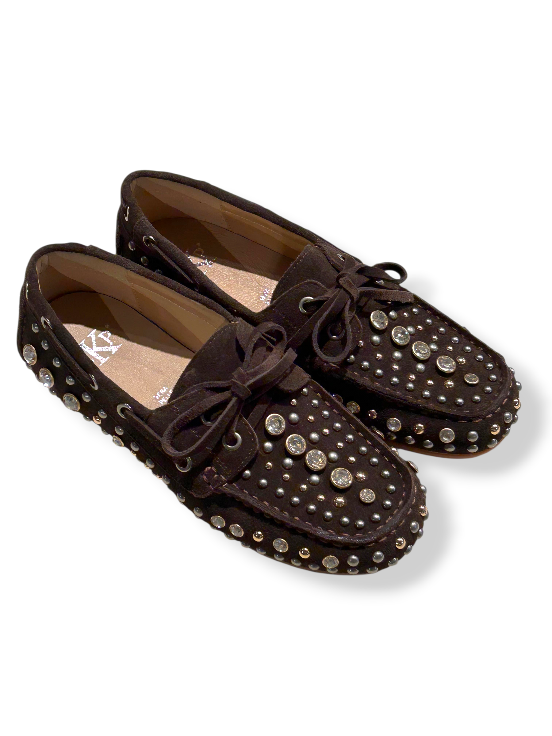 EKP - MOCASSINI BARCHETTA IN CAMOSCIO MORO CON BORCHIE STRASS ART. 4065