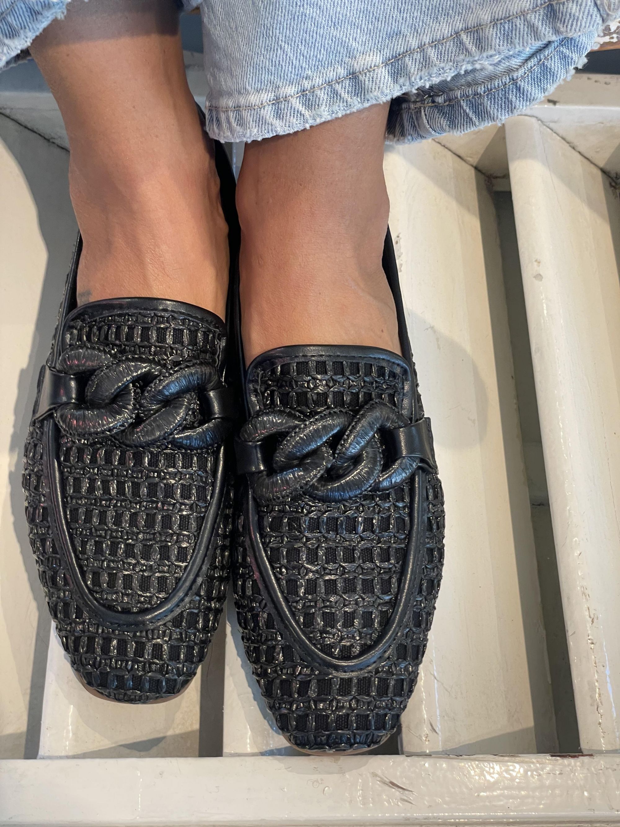 EXE - MOCASSINI IN RAFFIA NERA CON PASSANTE CATENA ART. 928